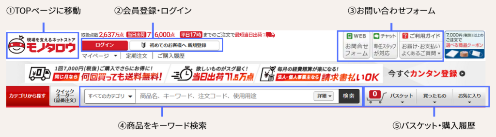 ①モノタロウのロゴをクリックするとTOPページに移動します。