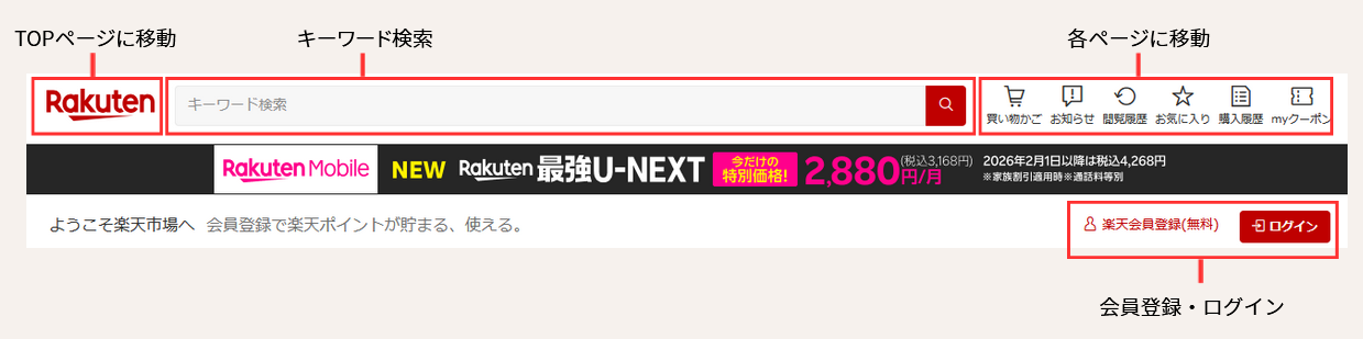 ③買い物かご、閲覧履歴、購入履歴などのよく使うページは右上にまとめられています。