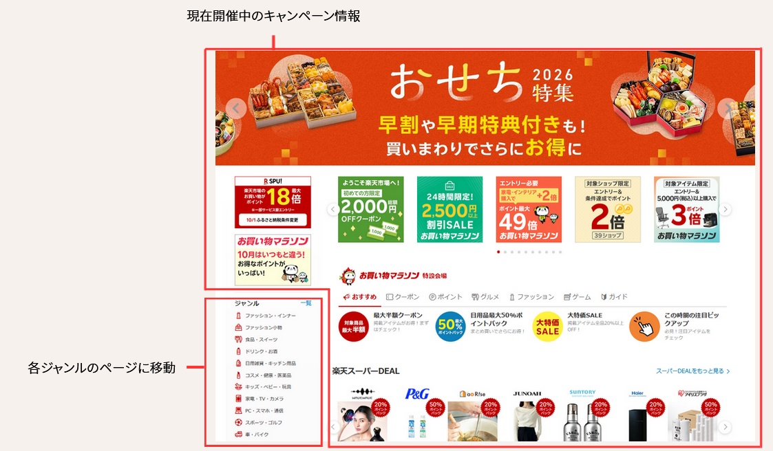 楽天市場は、ショッピングモールのように出店者が楽天市場内でショップを開き、ショップ内に商品を並べる形式のECサイトです。店舗ごとにブランドの世界観や商品構成を自由に考えられるのが大きな特徴ですが、ショップごとにレイアウトが違うので情報がどこにあるかわかりにくいというデメリットもあります。