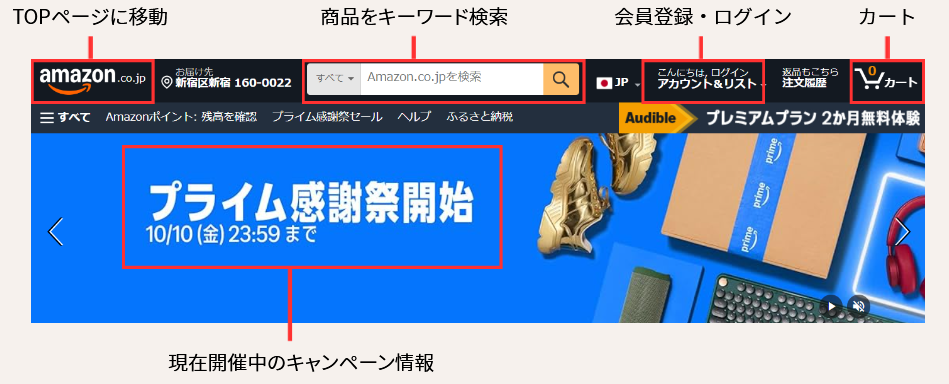 ① AmazonのロゴをクリックするとTOPページに移動します。