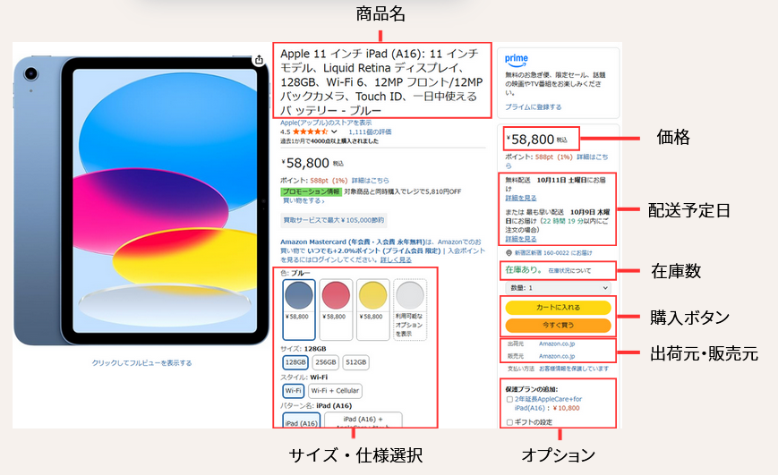 商品ページの大まかなレイアウトは基本的に統一されています。
